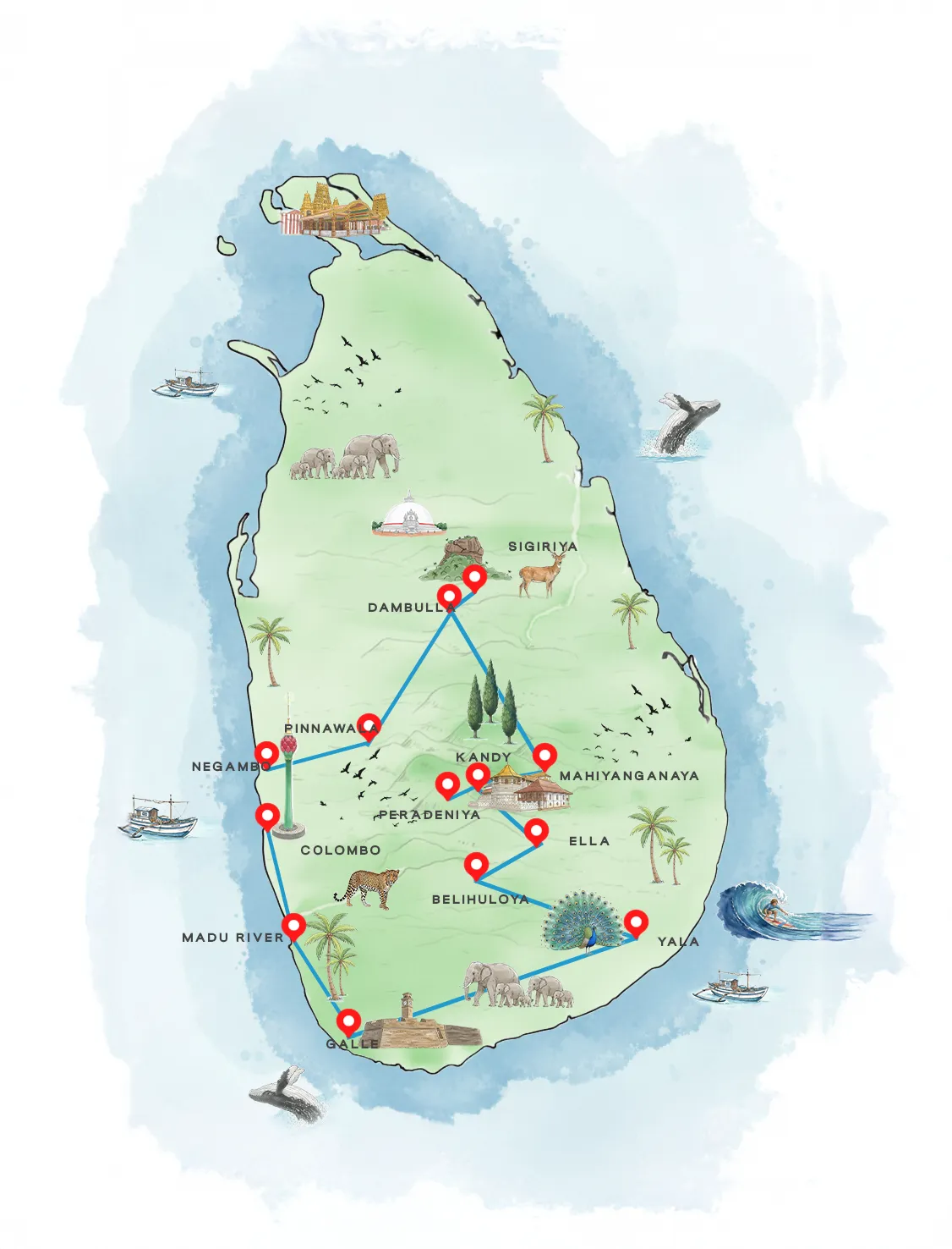 Destinations: Negombo  •  Dambulla  •  Sigiriya  •  Mahiyanganaya  •  Kandy  •  Ella  •  Belihuloya  •  Yala  •  Galle  •  Colombo
